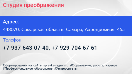 Студия преображения по адресу 443070, Самарская область, Самара, Аэродромная, 45а в дальнейшем Организация, размещена в следующих категориях: