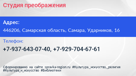 Студия преображения по адресу 446206, Самарская область, Самара, Ударников, 16 в дальнейшем Организация, размещена в следующих категориях: