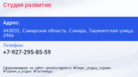 Студия развития по адресу 443031, Самарская область, Самара, Ташкентская улица, 246а в дальнейшем Организация, размещена в следующих категориях:
