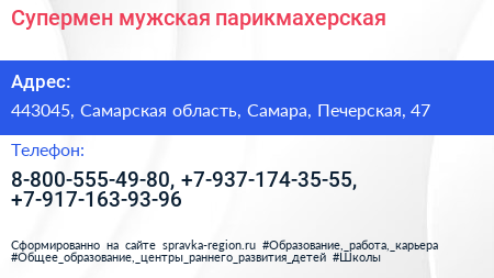 Супермен, мужская парикмахерская по адресу 443045, Самарская область, Самара, Печерская, 47 в дальнейшем Организация, размещена в следующих категориях: