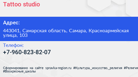Tattoo studio по адресу 443041, Самарская область, Самара, Красноармейская улица, 103 в дальнейшем Организация, размещена в следующих категориях: