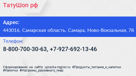ТатуШоп.рф по адресу 443016, Самарская область, Самара, Ново-Вокзальная, 78 в дальнейшем Организация, размещена в следующих категориях:
