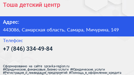 Тоша, детский центр по адресу 443086, Самарская область, Самара, Мичурина, 149 в дальнейшем Организация, размещена в следующих категориях: