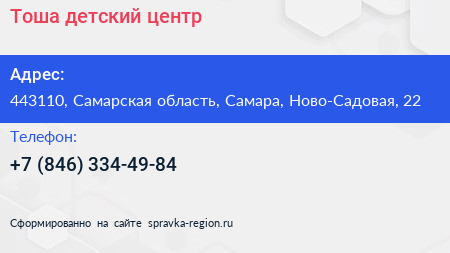 Тоша, детский центр по адресу 443110, Самарская область, Самара, Ново-Садовая, 22 в дальнейшем Организация, размещена в следующих категориях: