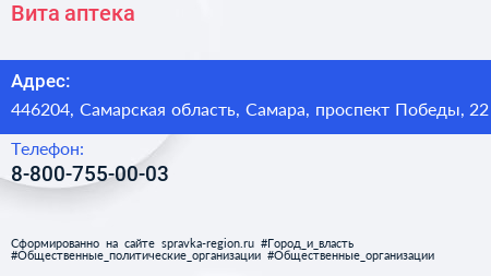 Вита, аптека по адресу 446204, Самарская область, Самара, проспект Победы, 22 в дальнейшем Организация, размещена в следующих категориях: