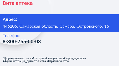 Вита, аптека по адресу 446206, Самарская область, Самара, Островского, 16 в дальнейшем Организация, размещена в следующих категориях: