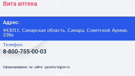 Вита, аптека по адресу 443011, Самарская область, Самара, Советской Армии, 238а в дальнейшем Организация, размещена в следующих категориях: