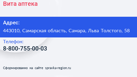 Вита, аптека по адресу 443010, Самарская область, Самара, Льва Толстого, 58 в дальнейшем Организация, размещена в следующих категориях: