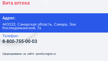 Вита, аптека по адресу 443122, Самарская область, Самара, Зои Космодемьянской, 7а в дальнейшем Организация, размещена в следующих категориях:
