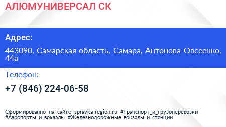 АЛЮМУНИВЕРСАЛ СК по адресу 443090, Самарская область, Самара, Антонова-Овсеенко, 44а в дальнейшем Организация, размещена в следующих категориях: