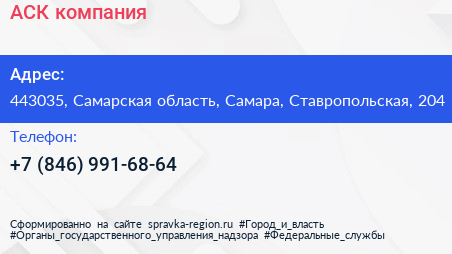 Для связи с организацией воспользуйтесь номером телефона: +7 (846) 991-68-64. Пн: c 08:30-17:30, Вт: c 08:30-17:30, Ср: c 08:30-17:30, Чт: c 08:30-17:30, Пт: c 08:30-17:30, Сб: выходной, Вс: выходной, вы можете обратиться в эту организацию.