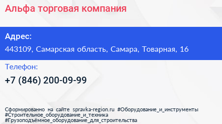 Альфа, торговая компания по адресу 443109, Самарская область, Самара, Товарная, 16 в дальнейшем Организация, размещена в следующих категориях: