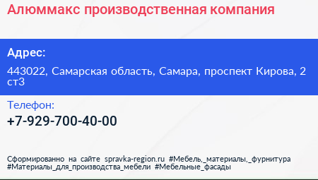Алюммакс, производственная компания по адресу 443022, Самарская область, Самара, проспект Кирова, 2 ст3 в дальнейшем Организация, размещена в следующих категориях:
