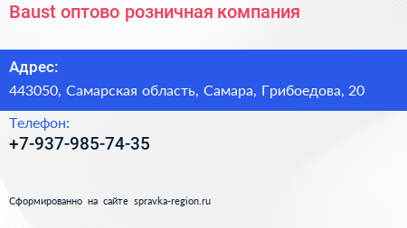Baust, оптово-розничная компания по адресу 443050, Самарская область, Самара, Грибоедова, 20 в дальнейшем Организация, размещена в следующих категориях: