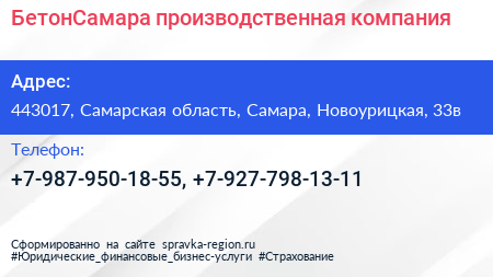 БетонСамара, производственная компания по адресу 443017, Самарская область, Самара, Новоурицкая, 33в в дальнейшем Организация, размещена в следующих категориях:
