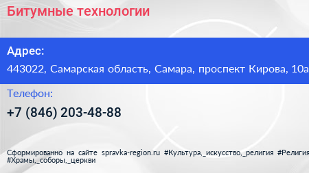 Битумные технологии по адресу 443022, Самарская область, Самара, проспект Кирова, 10а в дальнейшем Организация, размещена в следующих категориях: