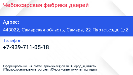 Чебоксарская фабрика дверей по адресу 443022, Самарская область, Самара, 22 Партсъезда, 1/2 в дальнейшем Организация, размещена в следующих категориях: