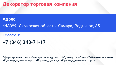Декоратор, торговая компания по адресу 443099, Самарская область, Самара, Водников, 35 в дальнейшем Организация, размещена в следующих категориях: