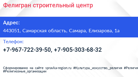 Фелигран, строительный центр по адресу 443051, Самарская область, Самара, Елизарова, 1а в дальнейшем Организация, размещена в следующих категориях: