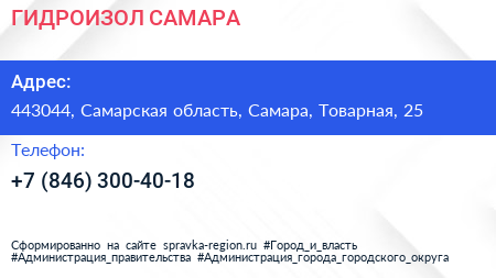 ГИДРОИЗОЛ-САМАРА по адресу 443044, Самарская область, Самара, Товарная, 25 в дальнейшем Организация, размещена в следующих категориях: