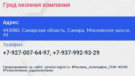 Град, оконная компания по адресу 443080, Самарская область, Самара, Московское шоссе, 41 в дальнейшем Организация, размещена в следующих категориях: