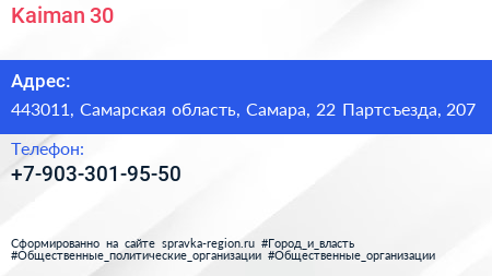 Kaiman 30 по адресу 443011, Самарская область, Самара, 22 Партсъезда, 207 в дальнейшем Организация, размещена в следующих категориях: