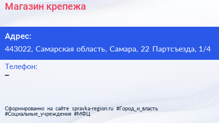 Магазин крепежа по адресу 443022, Самарская область, Самара, 22 Партсъезда, 1/4 в дальнейшем Организация, размещена в следующих категориях: