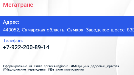 Мегатранс по адресу 443052, Самарская область, Самара, Заводское шоссе, 83Б в дальнейшем Организация, размещена в следующих категориях: