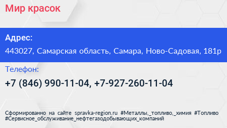 Мир красок по адресу 443027, Самарская область, Самара, Ново-Садовая, 181р в дальнейшем Организация, размещена в следующих категориях: