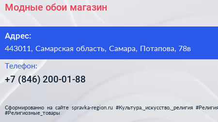 Модные обои, магазин по адресу 443011, Самарская область, Самара, Потапова, 78в в дальнейшем Организация, размещена в следующих категориях: