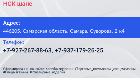 НСК шанс по адресу 446205, Самарская область, Самара, Суворова, 2 к4 в дальнейшем Организация, размещена в следующих категориях: