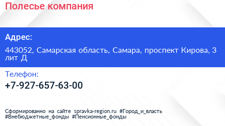 Полесье, компания по адресу 443052, Самарская область, Самара, проспект Кирова, 3 лит Д в дальнейшем Организация, размещена в следующих категориях: