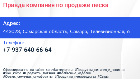 Правда, компания по продаже песка по адресу 443023, Самарская область, Самара, Телевизионная, 6 в дальнейшем Организация, размещена в следующих категориях: