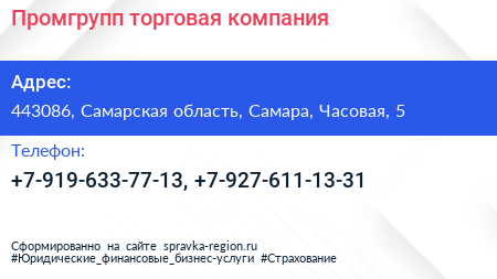 Промгрупп, торговая компания по адресу 443086, Самарская область, Самара, Часовая, 5 в дальнейшем Организация, размещена в следующих категориях: