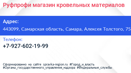 Руфпрофи, магазин кровельных материалов по адресу 443099, Самарская область, Самара, Алексея Толстого, 75 в дальнейшем Организация, размещена в следующих категориях: