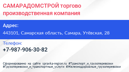 САМАРАДОМСТРОЙ, торгово-производственная компания по адресу 443101, Самарская область, Самара, Утёвская, 28 в дальнейшем Организация, размещена в следующих категориях: