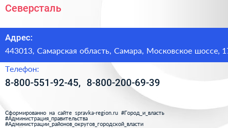Северсталь по адресу 443013, Самарская область, Самара, Московское шоссе, 17 в дальнейшем Организация, размещена в следующих категориях: