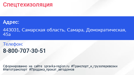 Спецтехизоляция по адресу 443031, Самарская область, Самара, Демократическая, 45а в дальнейшем Организация, размещена в следующих категориях:
