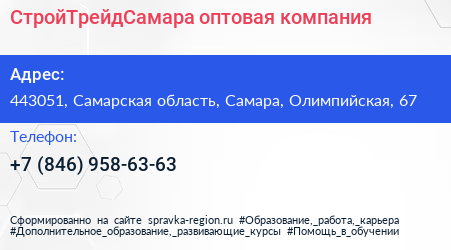 СтройТрейдСамара, оптовая компания по адресу 443051, Самарская область, Самара, Олимпийская, 67 в дальнейшем Организация, размещена в следующих категориях: