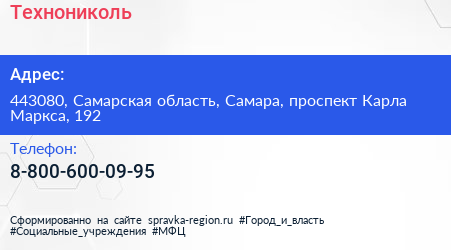 Технониколь по адресу 443080, Самарская область, Самара, проспект Карла Маркса, 192 в дальнейшем Организация, размещена в следующих категориях: