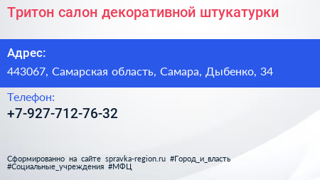 Тритон, салон декоративной штукатурки по адресу 443067, Самарская область, Самара, Дыбенко, 34 в дальнейшем Организация, размещена в следующих категориях: