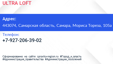 ULTRA LOFT по адресу 443074, Самарская область, Самара, Мориса Тореза, 105а в дальнейшем Организация, размещена в следующих категориях: