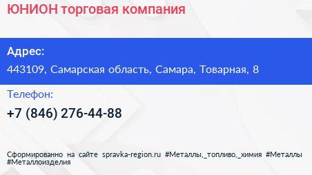 ЮНИОН, торговая компания по адресу 443109, Самарская область, Самара, Товарная, 8 в дальнейшем Организация, размещена в следующих категориях: