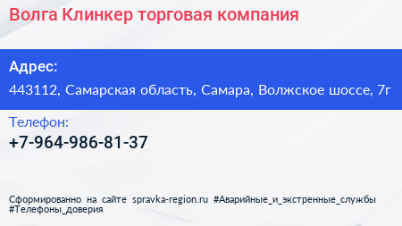 Волга-Клинкер, торговая компания по адресу 443112, Самарская область, Самара, Волжское шоссе, 7г в дальнейшем Организация, размещена в следующих категориях: