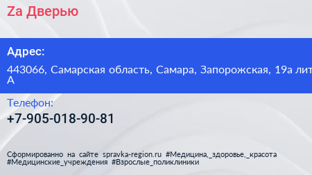 Za Дверью по адресу 443066, Самарская область, Самара, Запорожская, 19а лит А в дальнейшем Организация, размещена в следующих категориях: