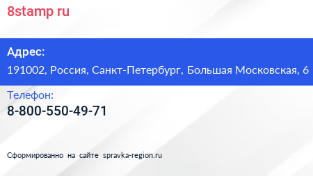 8stamp.ru по адресу 191002, Россия, Санкт-Петербург, Большая Московская, 6 в дальнейшем Организация, размещена в следующих категориях: