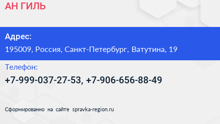 АН.ГИЛЬ по адресу 195009, Россия, Санкт-Петербург, Ватутина, 19 в дальнейшем Организация, размещена в следующих категориях: