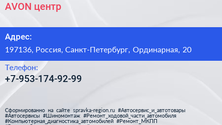 AVON, центр по адресу 197136, Россия, Санкт-Петербург, Ординарная, 20 в дальнейшем Организация, размещена в следующих категориях: