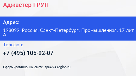 Аджастер ГРУП по адресу 198099, Россия, Санкт-Петербург, Промышленная, 17 лит А в дальнейшем Организация, размещена в следующих категориях: