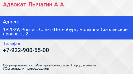 Адвокат Лычагин А.А. по адресу 192029, Россия, Санкт-Петербург, Большой Смоленский проспект, 2 в дальнейшем Организация, размещена в следующих категориях: